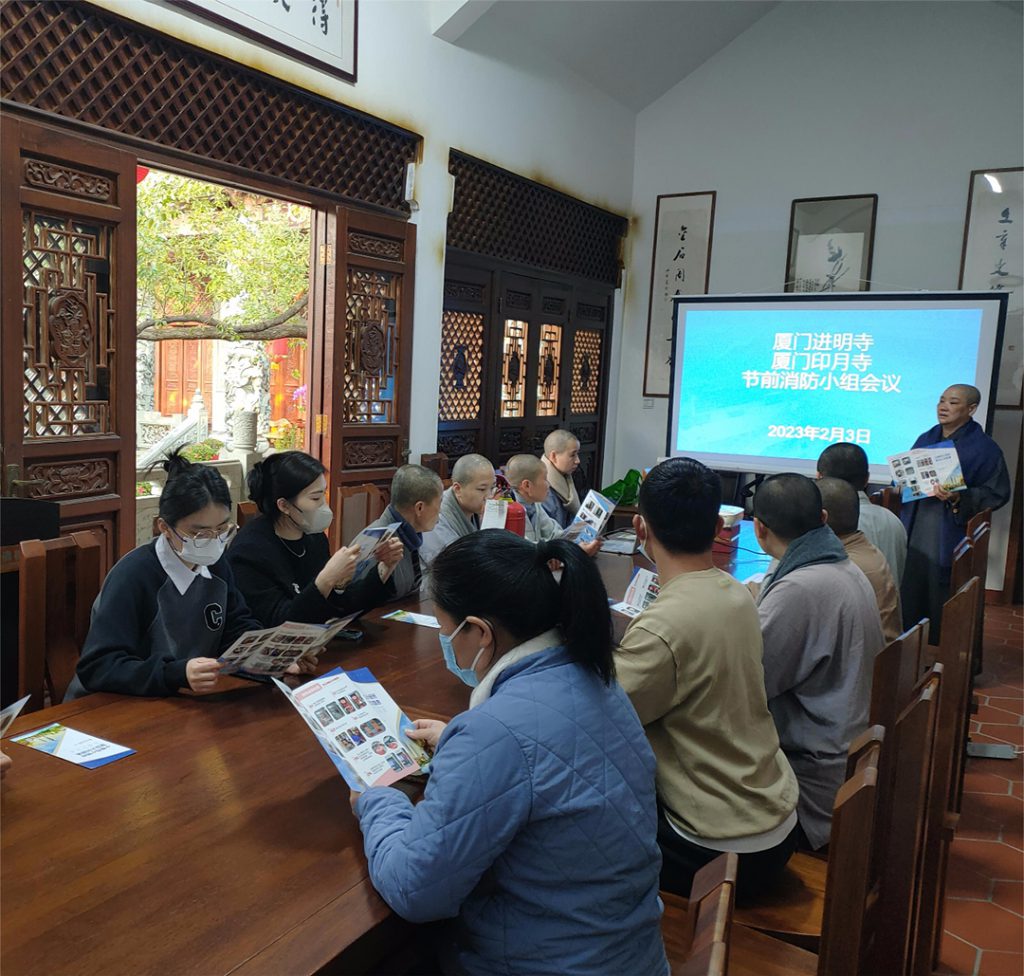 为切实增强教职人员和居士消防安全意识,做好寺庙消防安全工作,提升寺庙火灾防控能力,2月3日下午,厦门进明寺、印月寺开展消防小组学习部署会。福建省佛教协会副秘书长、厦门进明寺、印月寺住持普端法师在会上强调了寺院防火的重要性,重点针对日常用火用电安全各项制度、工作安排进行了详细讲解,要求所有僧众务必切实提高安全意识、火灾防范意识。