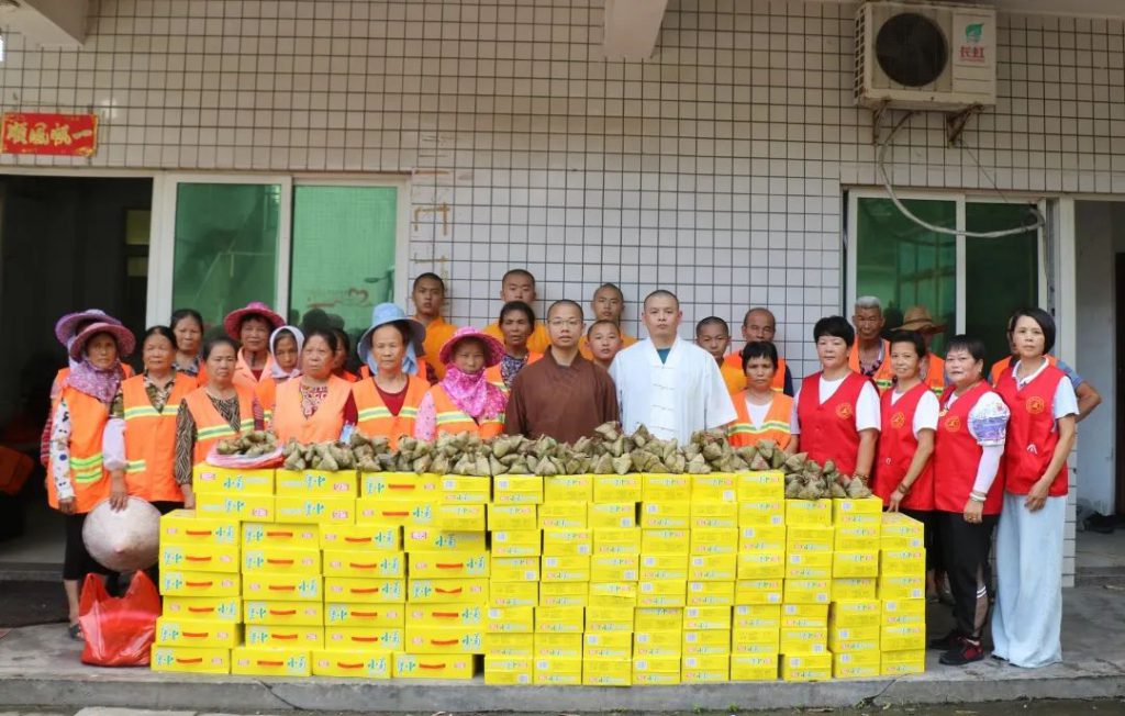 6月19日下午,泉州少林寺监院理诚法师带领寺院僧众及居士为环卫工人们送去香糯的粽子和暖心的祝福。