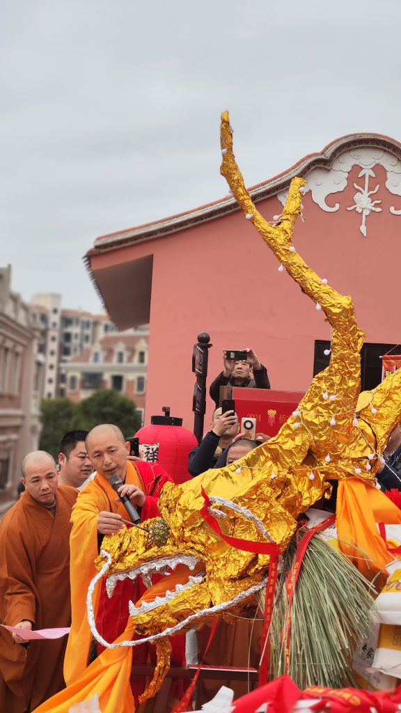 2月27日上午,泉州少林寺举行“福米龙”点睛祈福仪式,吸引五百多名信众参加。福建省佛教协会副会长、泉州少林寺方丈常定法师主法,大家共同为新的一年祈福,祈求国泰民安、山河无恙、人间皆安。